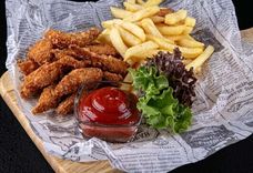 150/150/50 г • Мясо цыпленка, обжаренное в панировке, с картофелем фри и томатным соусом