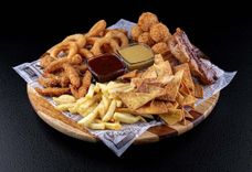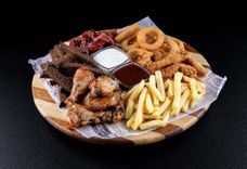 750/100 г • Куриные наггетсы, луковые кольца, сырные шарики, хрустящая тортилья с картофелем фри и сочные свиные ребрышки в сочетании с горчицей и соусом Барбекю