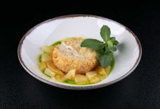 170/120/60 г • Нежный мягкий сыр с благородной белой плесенью, запеченный в панировке, в сочетании с соусом из персика и ананаса, подается с хрустящими гренками с зеленым маслом