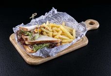 240/150/50 г • Румяные тосты в сочетании с мясом цыпленка, свежим томатом, листьями салата и соусом Цезарь, подается с хрустящим картофелем фри и томатным соусом